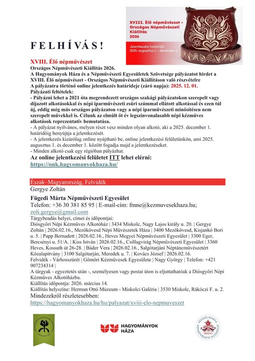 „Virágzó népművészet” című pályázatát, immár tizenkettedik alkalommal, a hagyományteremtő rendezvényükre pályamunkákat várnak a népművészet minden szakágából.