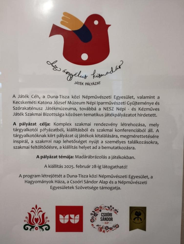 A Játék Céh, a Duna-Tisza közi Népművészeti Egyesület, valamint a Kecskeméti Katona József Múzeum Népi Iparművészeti Gyűjteménye és Szórakaténusz Játékmúzeuma, továbbá a Népművészeti Egyesületek Szövetsége Népi- és Kézműves Játék Szakmai Bizottsága közösen hirdette meg a tematikus pályázatot melynek témája: Madárábrázolás a játékokban.