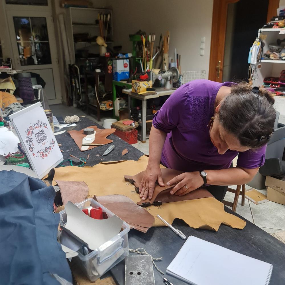 Első foglalkozásuk az online térben zajlott, ahol megbeszéltek mindent, ami a kezdéshez szükséges. Így Ágota 2024. április 13.-án már a papírból elkészített szabásmintával érkezett a Mesterekhez, a műhelybe. Egy kicsit változtatni, alakítani kellett a mintán, mivel a bőr másképpen viselkedik a valóságban, mint a papír. A megfelelő bőr alapanyag kiválasztása után hozzá is kezdtek az alkatrészek kivágásához, és megbeszélték, hogyan, milyen sorrendben kell azokat majd összedolgozni. Házi feladatként kell elkészítenie az összeállításhoz szükséges alkatrészeket, kédereket, a kanálcsíkot, a francia szegéshez a bőrt. Valamint a táska fedelén és az övön felhelyezésre kerülő zománc díszt.