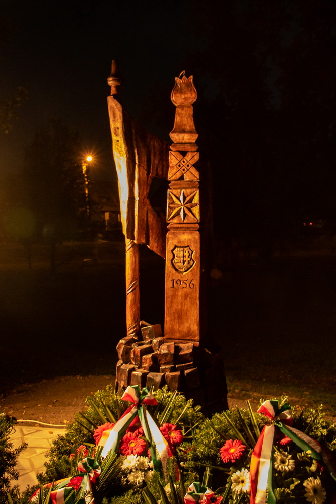 „Az utcaköveken áttörő kopjafát féltőn öleli körbe a forradalom lyukas zászlaja. A kopjafa mint egyetemes magyar szimbólum beszél hozzánk. Jelképei történeteket mesélnek el. Ebben az esetben a betlehemi csillag a reményt, a parázs a mélyben szunnyadó mindig fellobbanó szabadságvágyat, a csúcsán a bimbós tulipán a fiatalságot, az örök megújulást jelképezi. A kockakő pedig a forradalmak legkézenfekvőbb fegyvere, talajként és védelemként is szolgál a küzdelemben. Ezzel az emlékművel a magyar szabadság ifjú hőseinek állítunk emléket akik őrizték a szabadságba vetett hitet és remélték a győzelmet. A szabadság bajnokaira emlékezzünk most, mert ahol a hősöket nem felejtik, mindig lesznek újak! …”