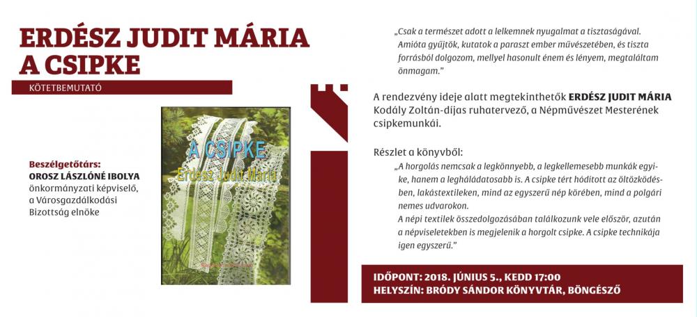 Az ünnepi könyvhét alkalmából jelent  meg  Erdész Judit Mária  ötödik könyve "Csipke"  címmel. A könyv   bemutatásra 2018 június 5.-én 17 órakor a Megyei könyvtár emeleti termében kerül sor.. "Egy kis kiállítás a csipkéből " mottóval az érdeklődőket két  vitrin várja, bemutatva  csipkék  csodás  világát.  A csipke a viseletben és a textilek díszítésében a legegyszerűbb díszítési mód. A könyv tartalmazza a csipke készítését, és alkalmazását a textileken  a viseletek összeállítását és díszítését,szélcsipkéket ,sarkosítást és  rengeteg mintát .  Minden érdeklődőt  szeretettel  vár a szerző,  Erész Judit Mária  népi iparművész,  a Népművészet  Mestere.
