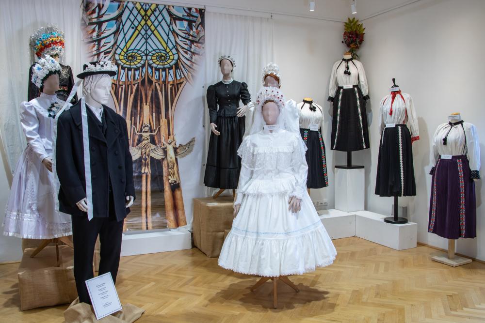 A kiállításon gyönyörködhetünk az esküvő és az ünnepkörhöz kapcsolódva: hagyományos székely-, halasi ünnepi-, bukovinai székely-, kalotaszegi nyargalásos bujka- és palóc viseletekben. Valamint láthatunk paraszt-polgári viseleteket, hagyomány és a modernitás együttes megjelenésében mérai kollekciókat.
