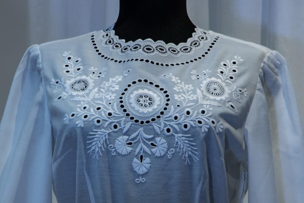 Olyan női öltözetek, ruhaköltemények láthatóak a kiállításon, melyekről a kifinomult női elegancia sugárzik, hagyomány és modernitás, régi és új találkozik a kollekciókban, amely formavilágában a népművészetet ötvözi.