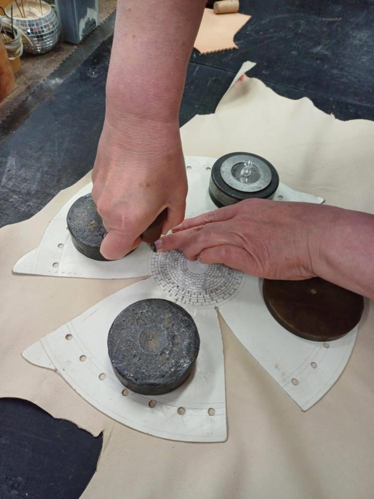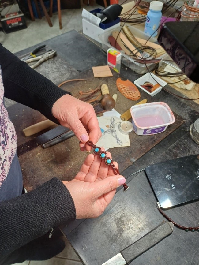 A szíjgyártók sallang fonásos lószerszám dísz készítési technika folyamatának elsajátítása nem lapos, hanem hengeres bőrön alkalmazva, amiből különleges ékszer lesz a végeredmény. Tűzzománc díszítéssel a nap végére el is készült egy karkötő.