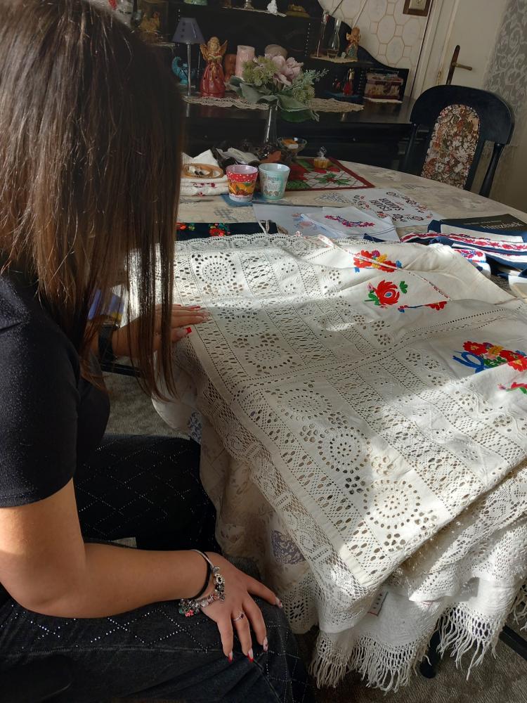 Kiara kezdőként vállalkozott a feladatra, de mivel művészeti iskolába jár, így nem okoz gondot majd a népi technikák elsajátítása. Örömmel vállalkozott a tanulásra. Ráhangolódásként eredeti, régi darabokat tanulmányoztak a Palóc Néprajzi gyűjtemény anyagából, fejkendőket, subrikás textileket nézegettek, majd a szakkönyveket, mintarajzokat ismertek meg a témához kapcsolódóan, a nógrádi hímzések köréből. Gyakorlati munkánkat egy palóc mintakendő hímzésével kezdték, amelyen az egyszerű öltéseket tanulja meg. A későbbiekben a munkaterv szerint haladnak tovább, melyben szerepel öltözet kiegészítők és lakástextilek készítése is, illetve minta rajzolás, sablonálás is. Jó hangulatban telt első találkozásuk, Kiara lelkes tanulónak bizonyul
