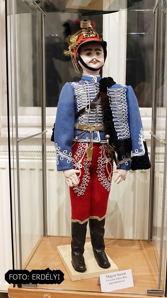 A szakkör munkái mellett még látható Lovászné Juhász Rita két viselete és egy díszmagyar viseletbe öltöztetett baba mellett egy magyar huszár díszruhája is.