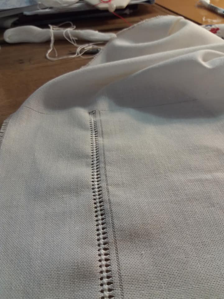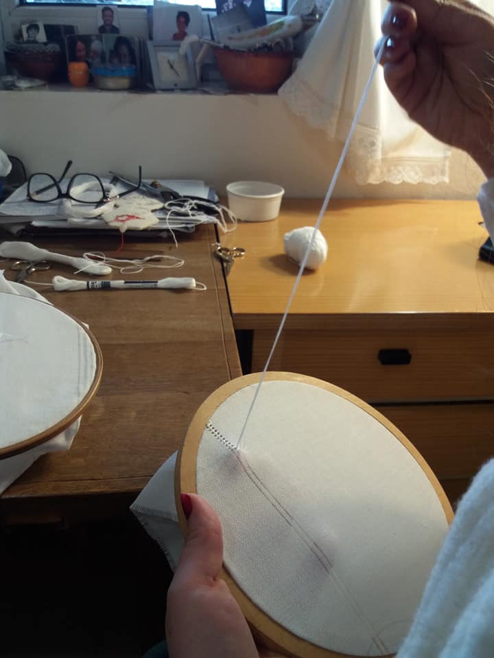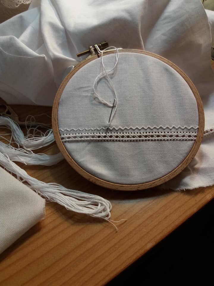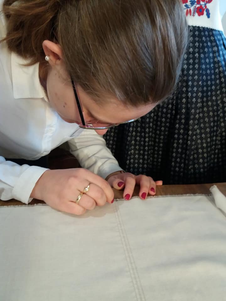 A Heves Megyei Népművészeti Egyesület, a Csoóri Sándor Alap támogatásával, a Mester és Inas program keretében képzést indított. Berzeviczy-Fehér Jánosné viseletkészítő, népi iparművész, a Népművészet Mestere műhelyében Stafira Bettina ismerkedik a palóc motívumokkal. Bettina ELTE BTK Néprajz Alapszakán folytatott tanulmányokat, diploma szerzés előtt áll. Jelenleg a palóc népviseletek, hímzések iránt érdeklődik. Első találkozásukkor elkezdték a palóc húzott ujjú ingváll ujjának díszítményének elkészítését. A "mesterke" és "borsóka" elkészítéséhez türelmesen kihúzták a szálakat és elkezdték az öltéstechnikák gyakorlását. Második találkozásuk során folytatták a "mesterke", "borsóka"valamint a "hutai"öltések gyakorlását. Kiválasztottakk egy kedves palóc motívumot, hogy hímzés is díszítse az ingváll ujját.