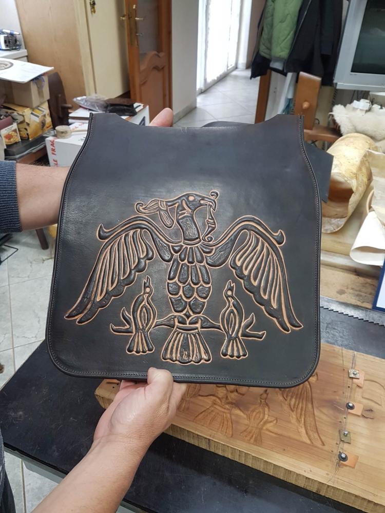 Miután a táska motívumának kontúrja ki lett csontozva, lehetett kezdeni a festést. Festés után az összeállítás folyamata több napja tart. Főleg azért, mert közben a sámán dobhoz szükséges alapanyagokat is elő kellett készíteni. (dob keret, ágas fa stb.)"
