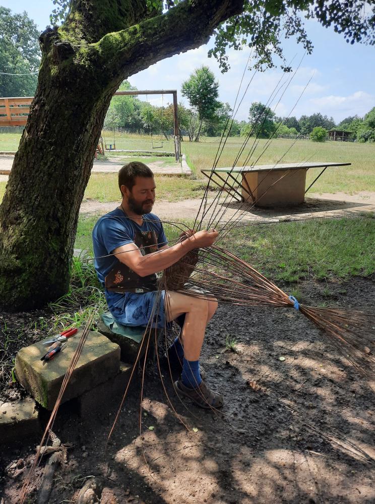 Természetesen a család kosárfonó tagja, azaz férjem, Mucsonyi Zsolt, ismét elmerült a vesszők kesze-kusza világába. A kicsi-nagy és még nagyobb gazdasági kosár kollekció mellett Kovács Zoltán mester, a Hagyományok Háza kosárfonó oktatója új fogásokat, formákat is tanított neki. Pénteken egy kis bőrözéssel zárta a tábort, egy fonott peremű tarsollyal.