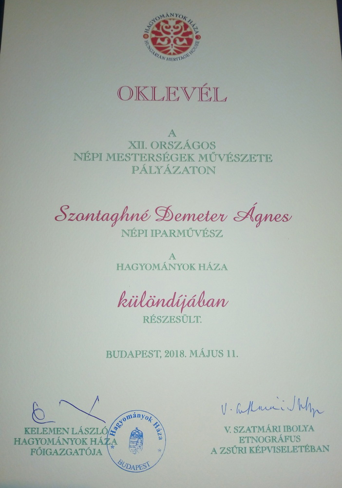 Szontaghné Demeter Ágnes népi iparművész, lószőrékszer kollekcióját a zsűri és a Hagyományok Háza KÜLÖNDÍJBAN részesítette.